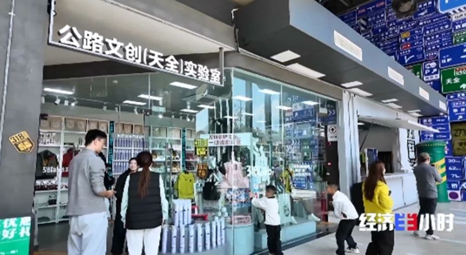 服务区内的文创店被叫作318文创实验室。店内常备60多个单品,除了传统的车贴、卫衣,甚至氧气瓶都在成为新爆款,年营收额能达到三四百万元。